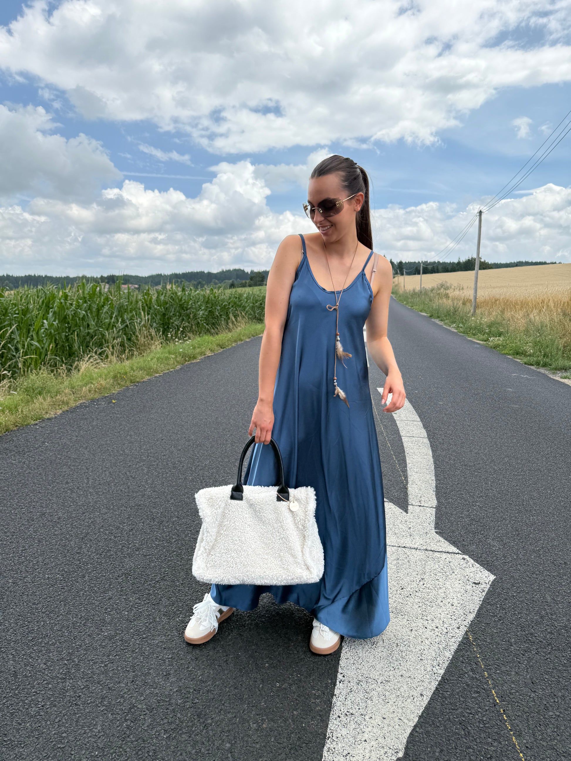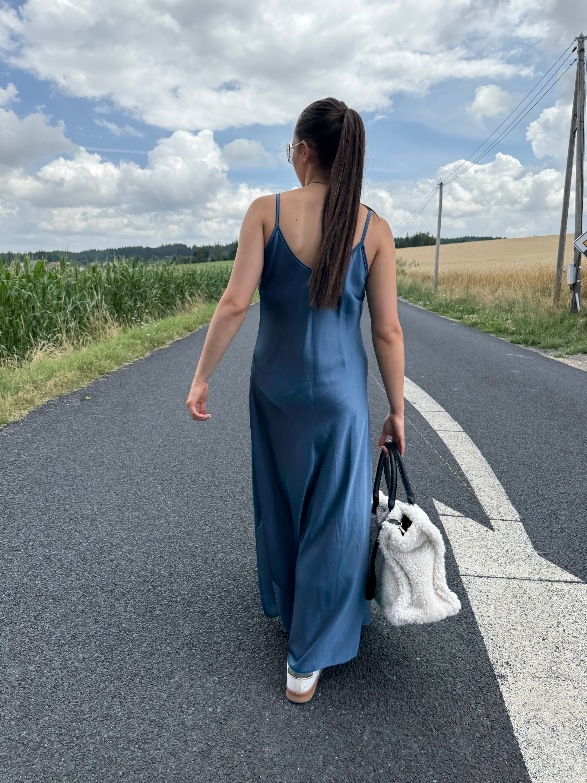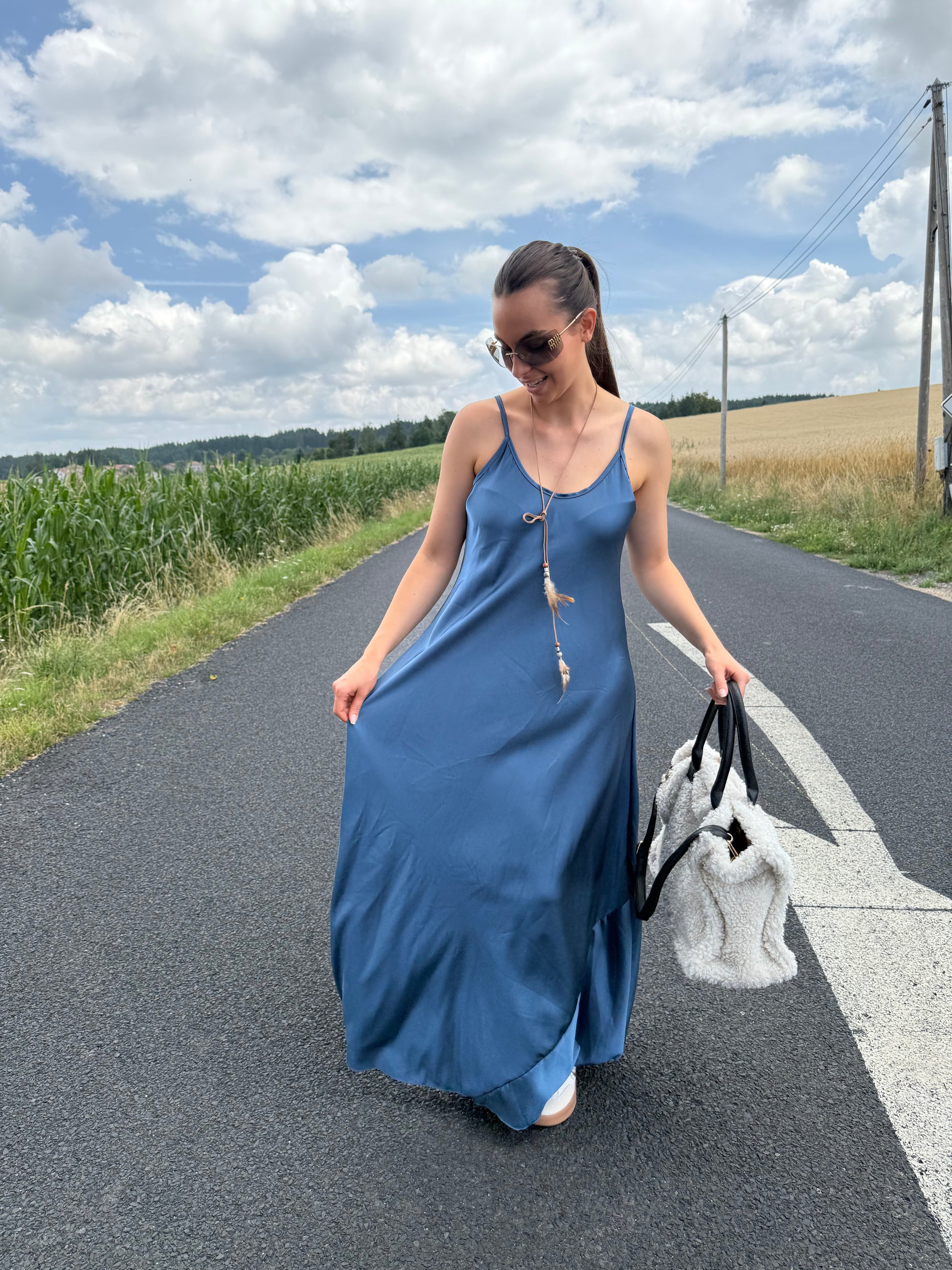 Avec ses fines bretelles et son style épuré, elle se porte aussi bien pour une balade pieds nus dans l’herbe que pour un déjeuner en ville avec un gilet léger.