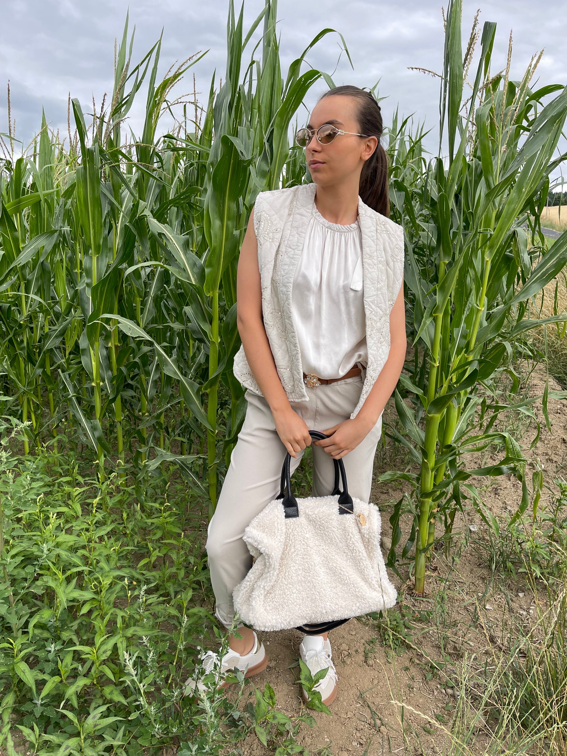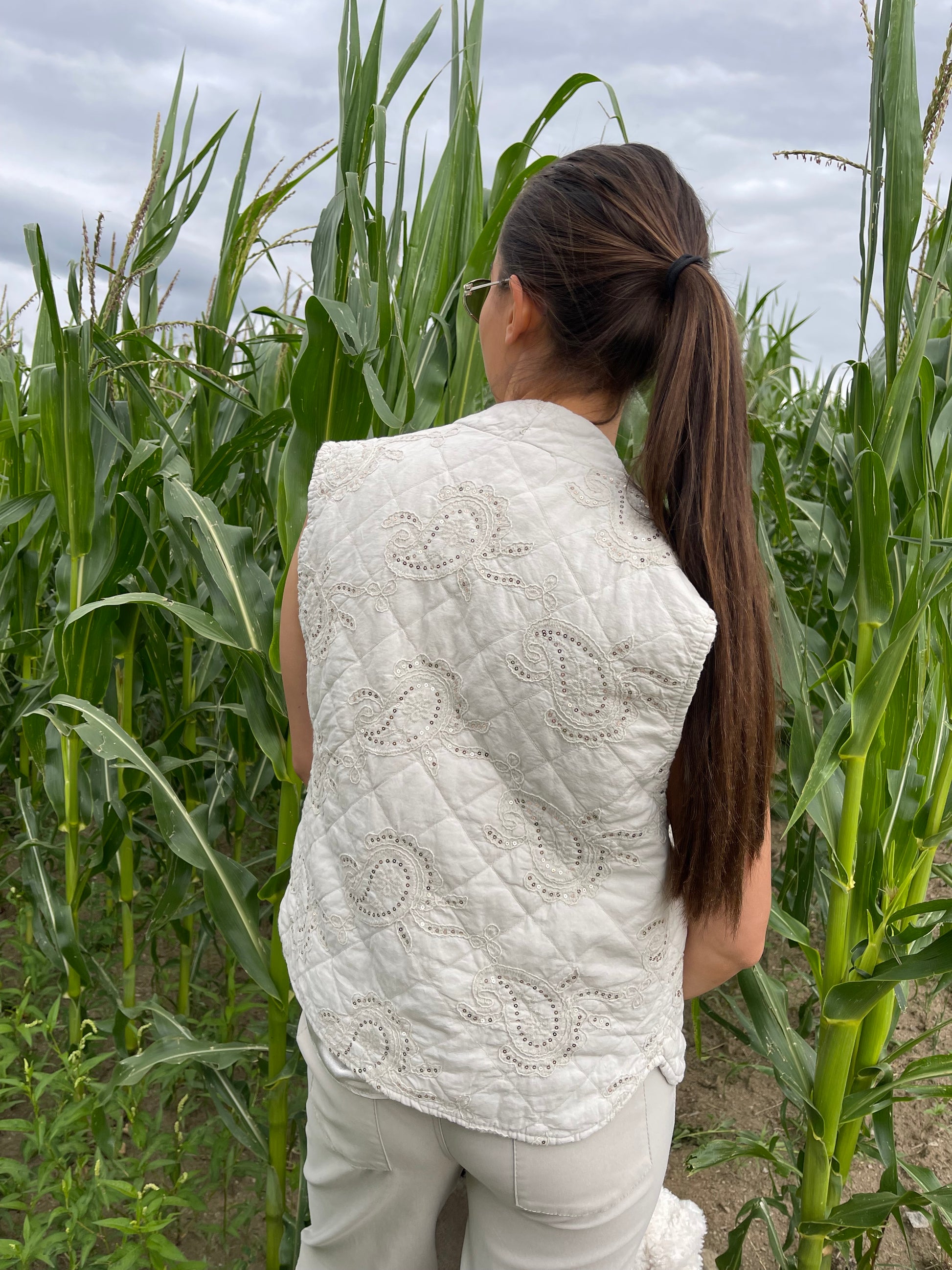 GARANCE, c’est un gilet sans manches, ouvert, sans chichis — mais avec ce motif bandana doré qui attire juste ce qu’il faut le regard.
