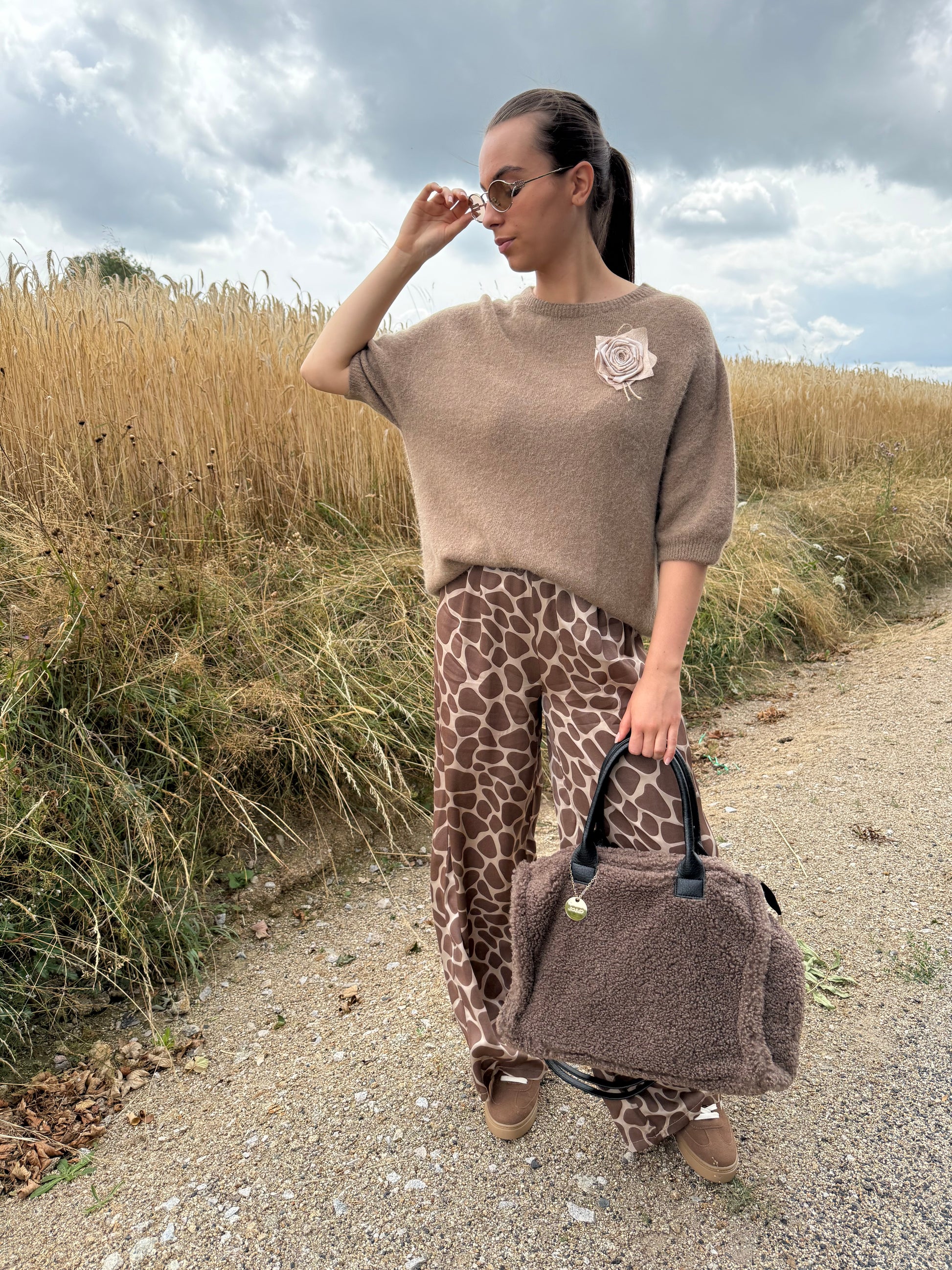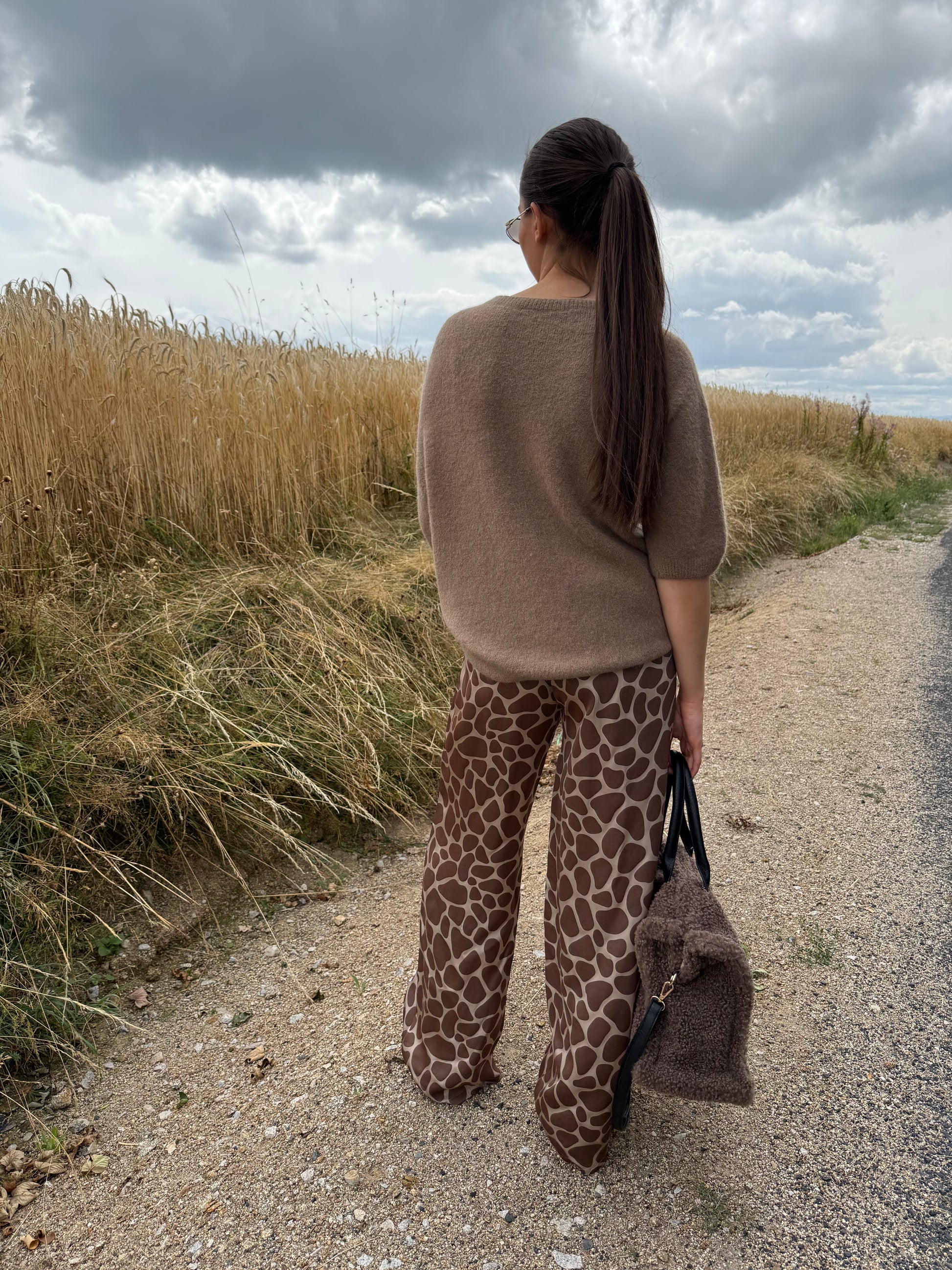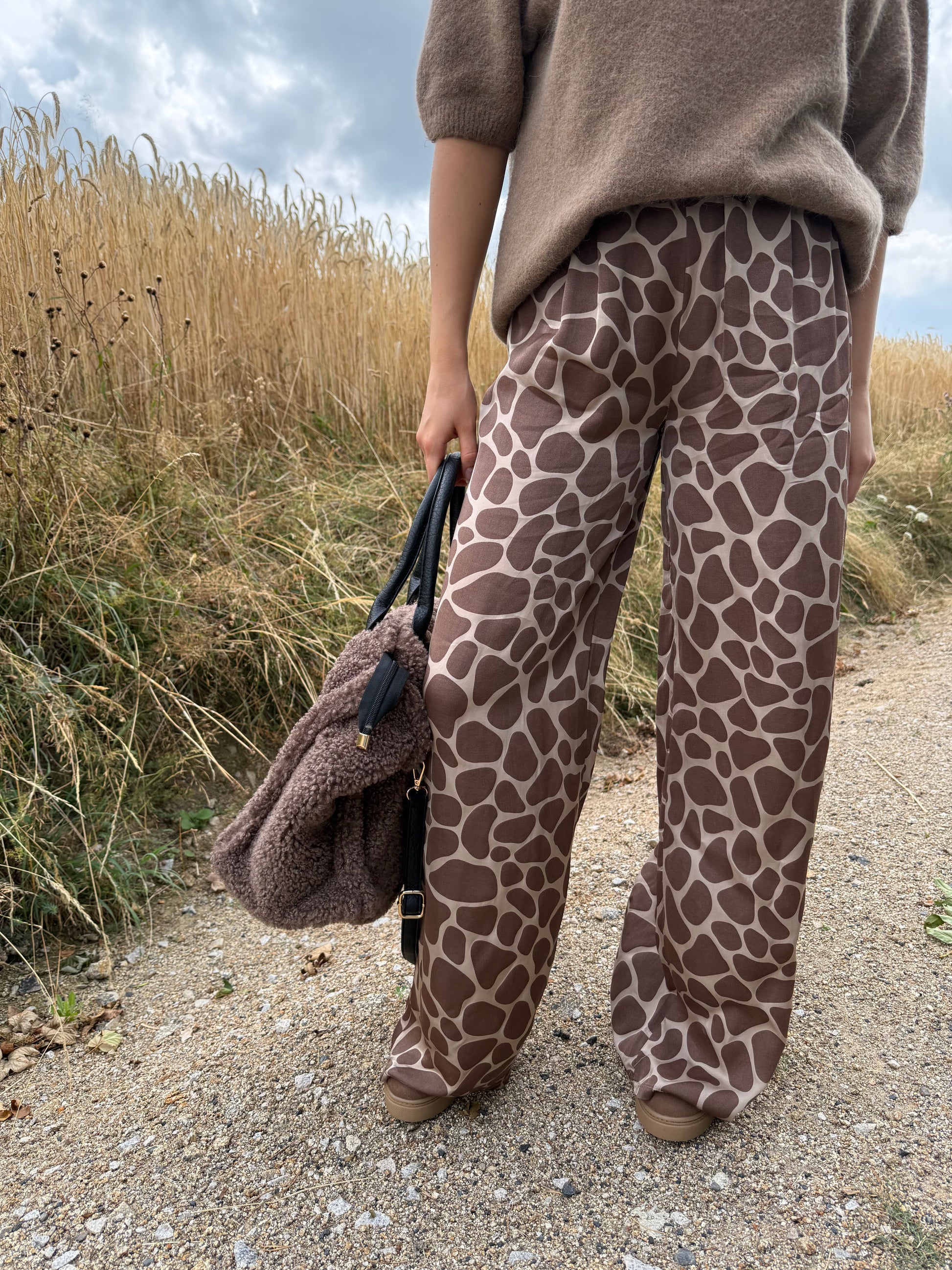Sa coupe fluide, sa jambe légèrement large et son imprimé girafe lui donnent un style sauvage mais maîtrisé.