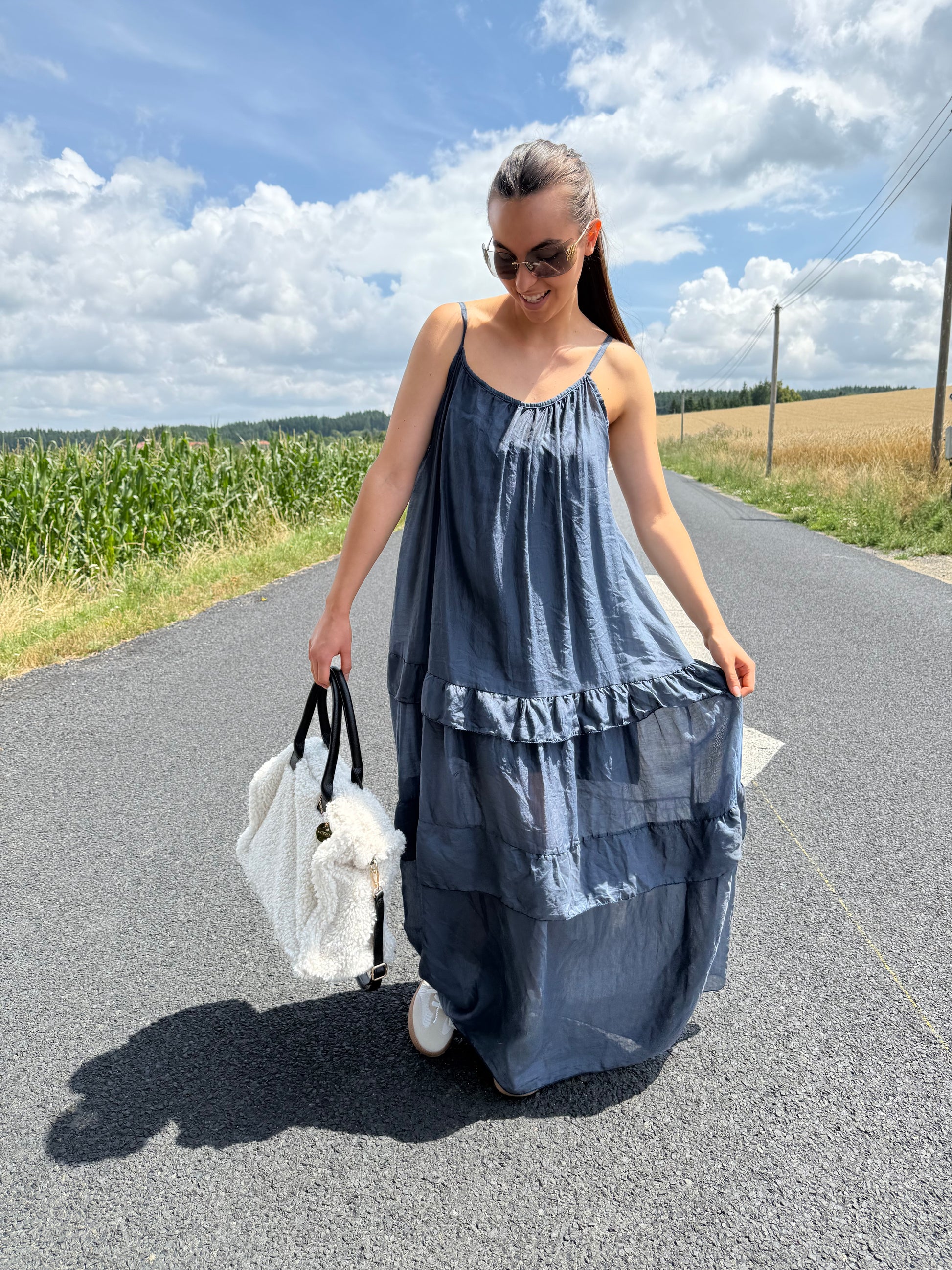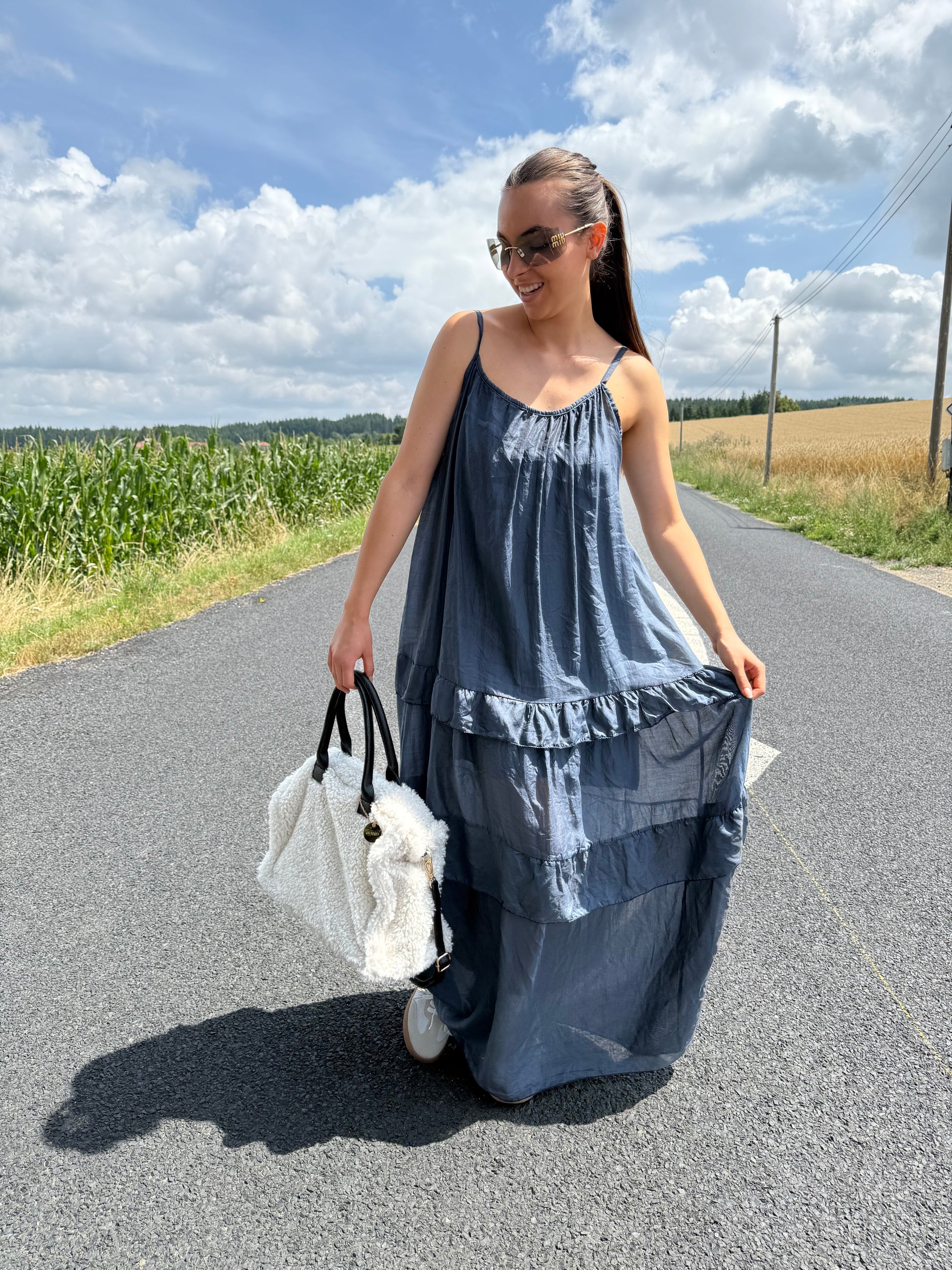 ORVAL, c’est la robe fluide qui respire l’été, avec sa coupe ample, ses bretelles fines et ses volants dansants qui bougent au rythme de vos pas.