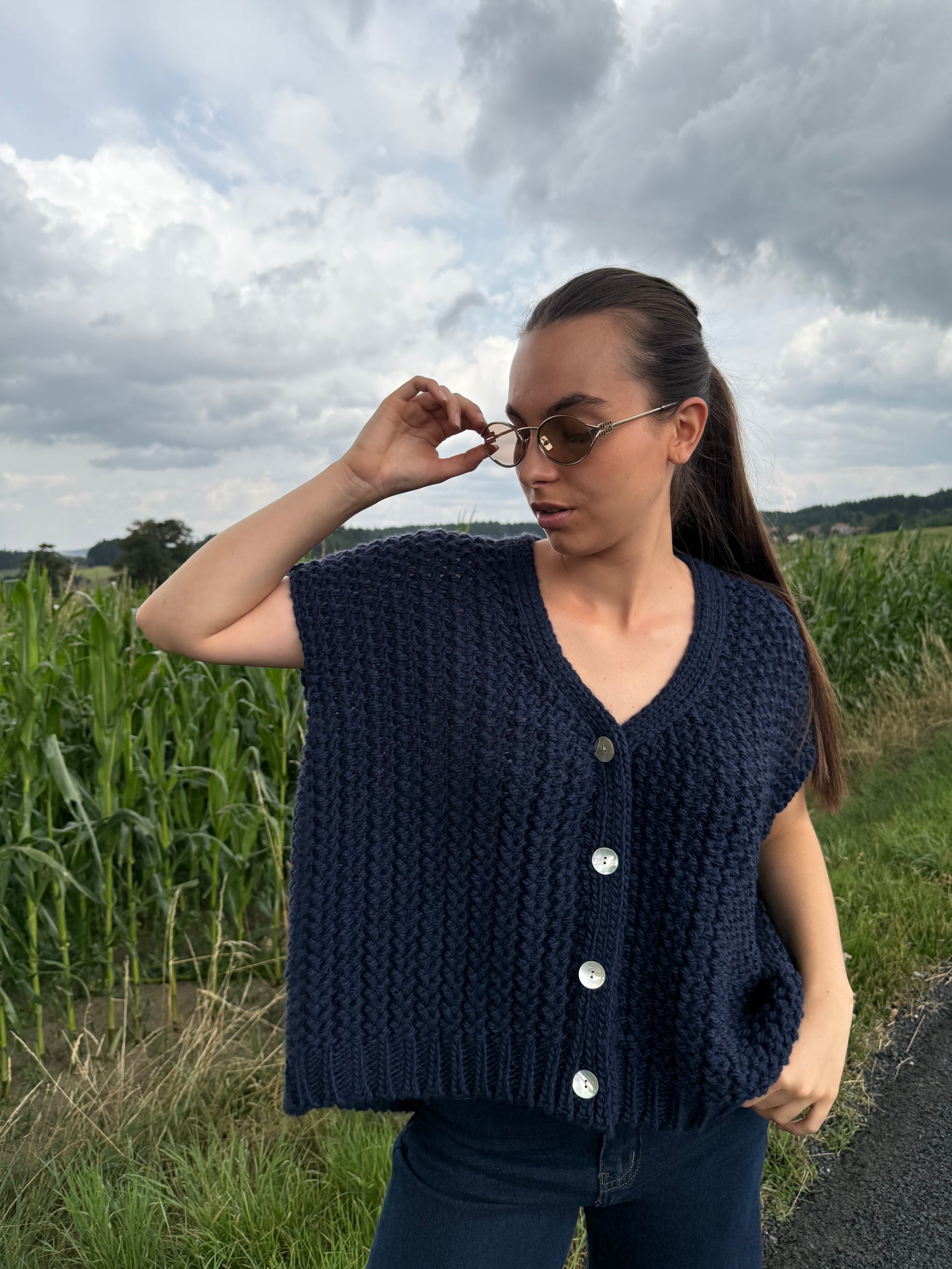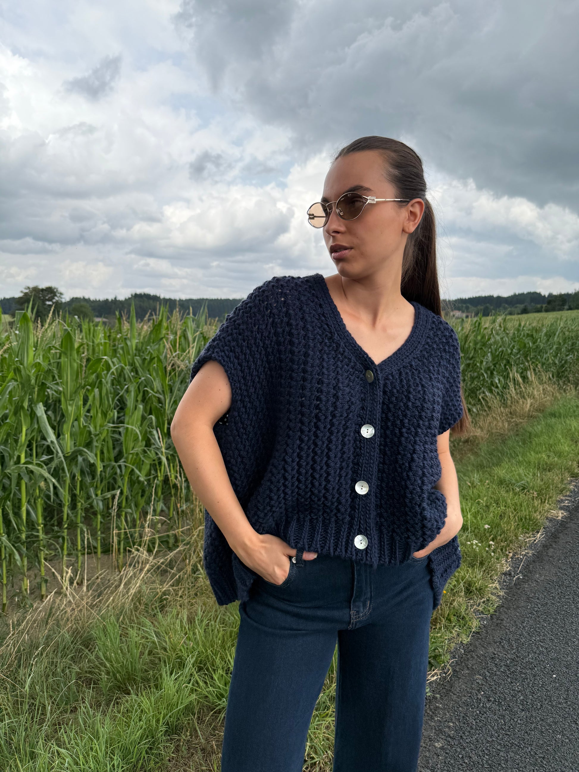 GRAIN, c’est le genre de pièce qu’on adore enfiler entre deux saisons : une maille épaisse qui donne de la structure, une coupe oversize sans manches, et de gros boutons nacrés pour la touche chic. À porter seul ou superposé sur une chemise blanche, selon l’humeur.