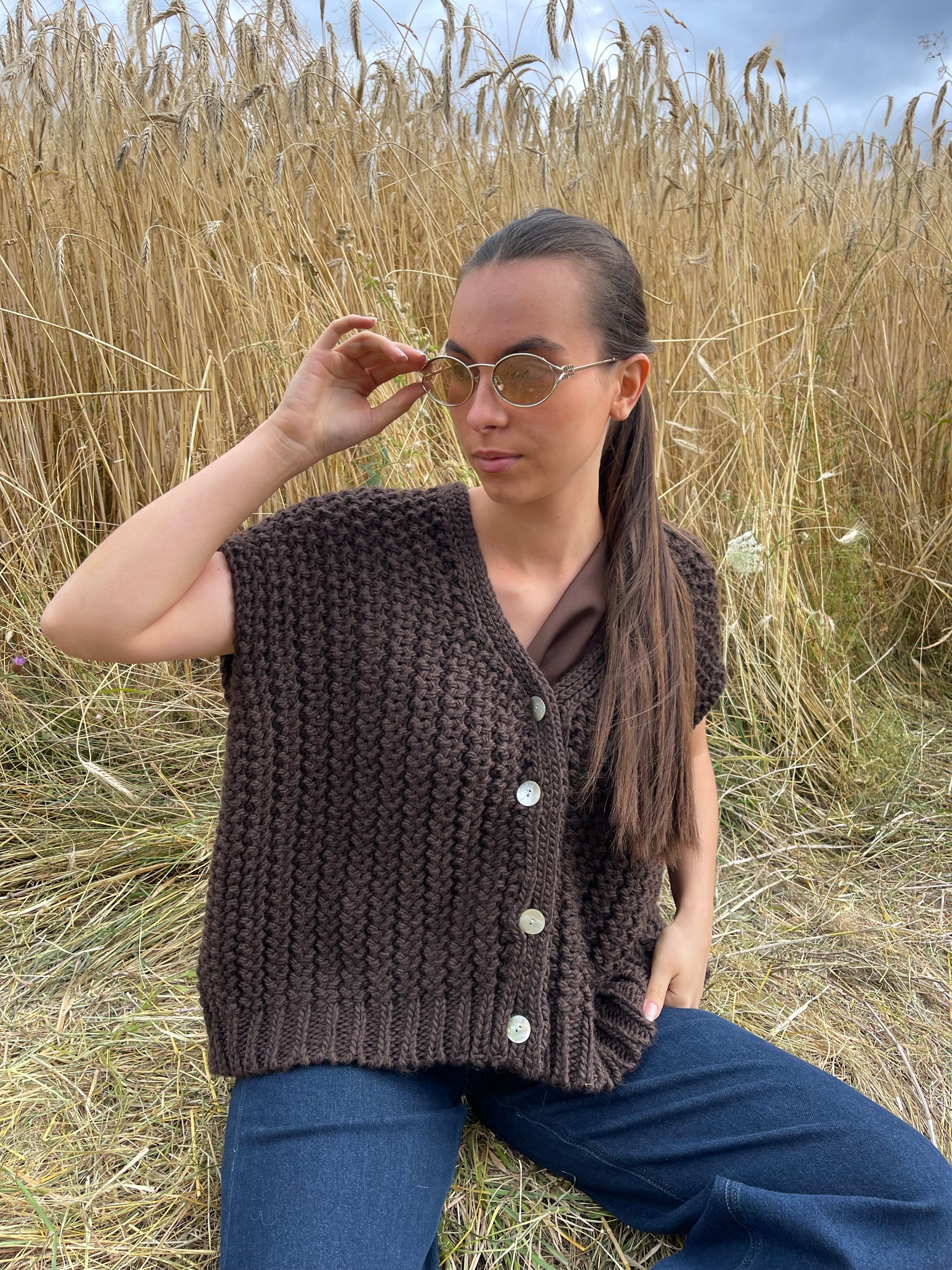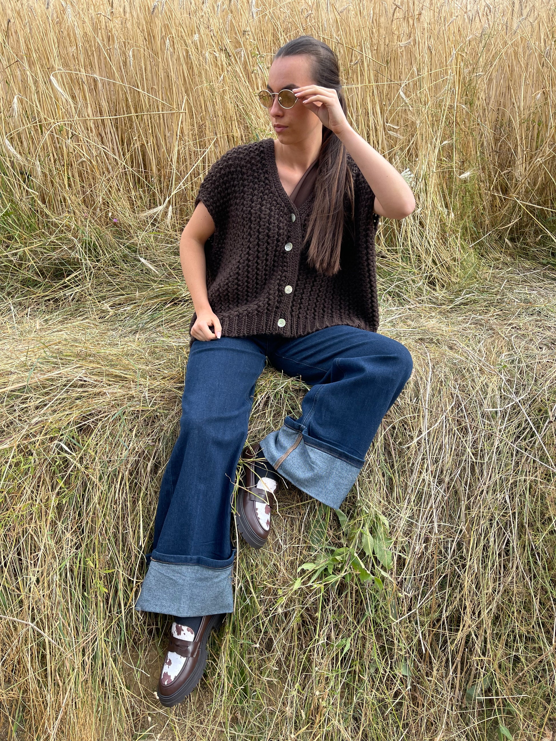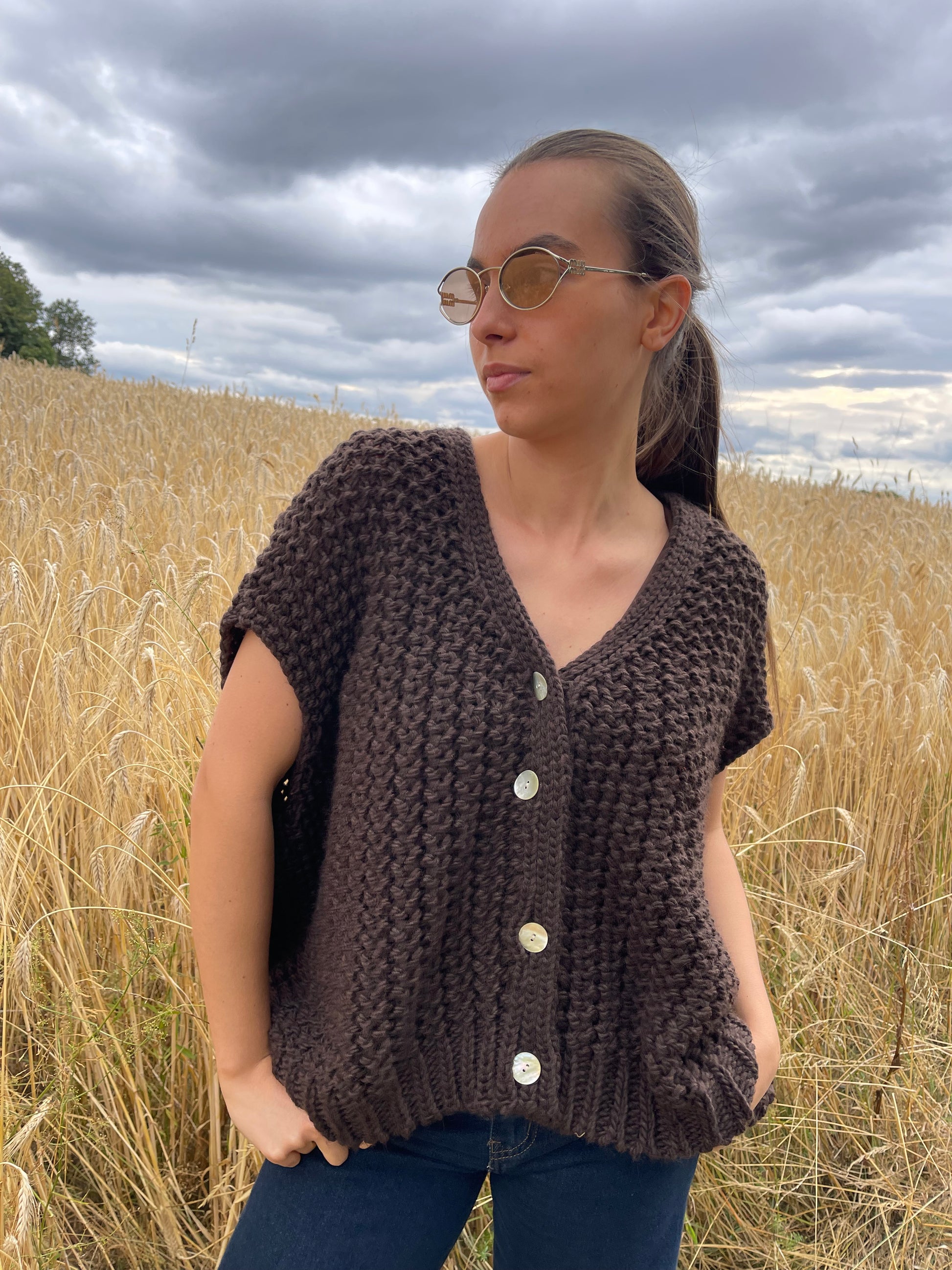 GRAIN, c’est le genre de pièce qu’on adore enfiler entre deux saisons : une maille épaisse qui donne de la structure, une coupe oversize sans manches, et de gros boutons nacrés pour la touche chic. À porter seul ou superposé sur une chemise blanche, selon l’humeur.