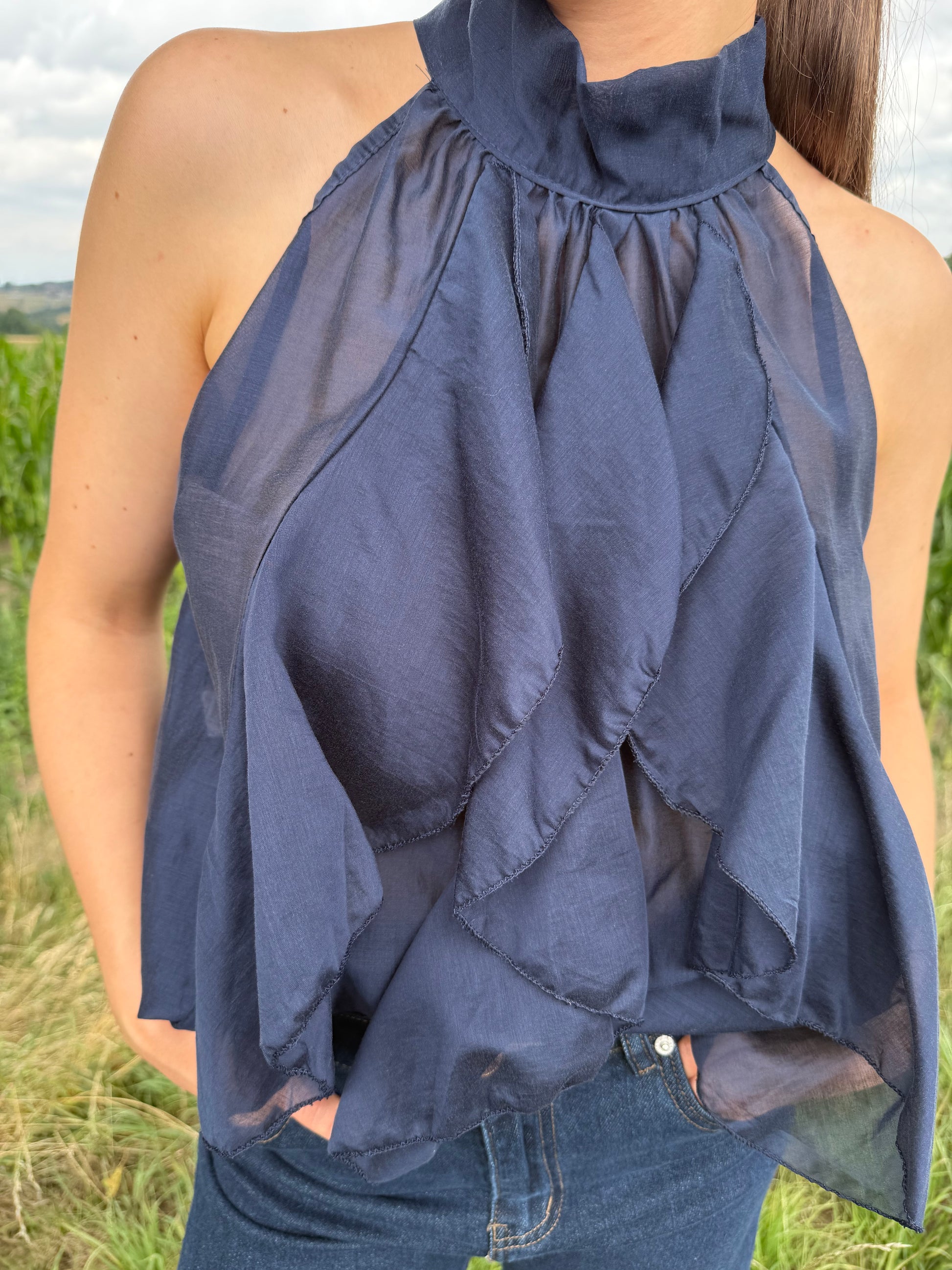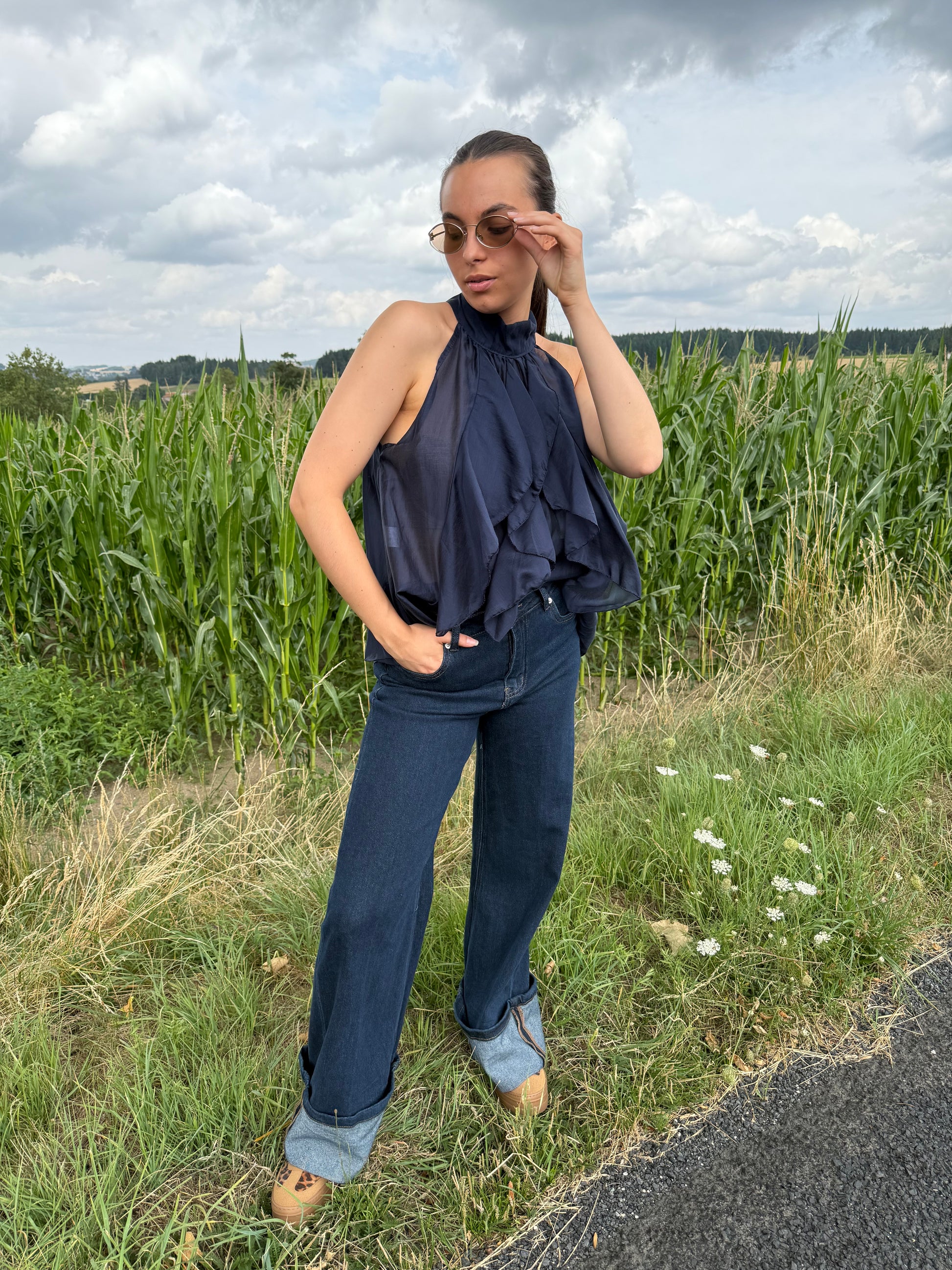 BRINDILLE, c’est le top qui élève n’importe quel look en deux secondes. Sans manches, il dévoile joliment les bras, tandis que les volants délicats jouent avec les volumes. Le bleu marine le rend aussi chic qu’un noir, mais plus doux. À porter rentré dans un pantalon fluide ou sur un jean blanc : toujours impeccable.