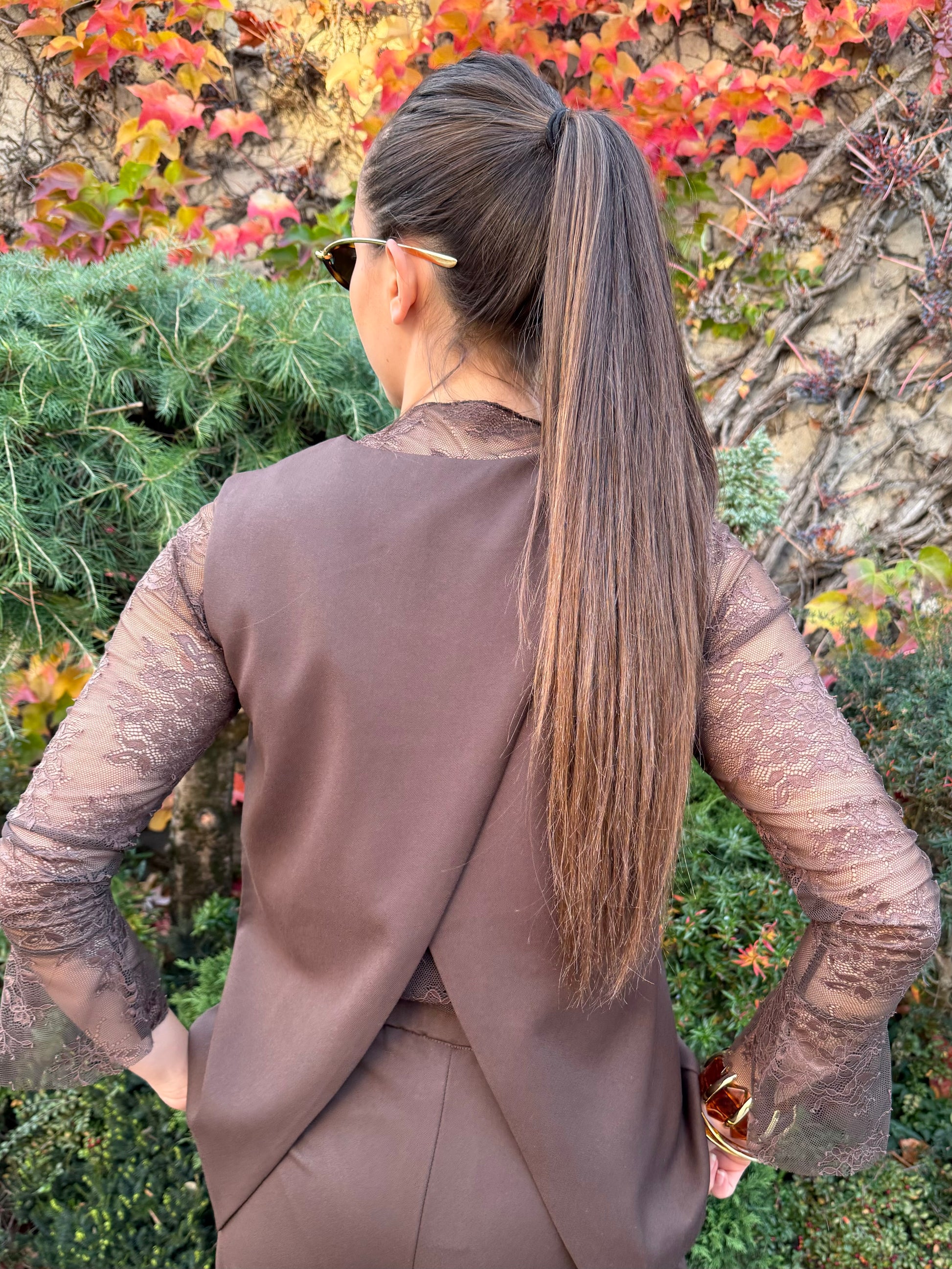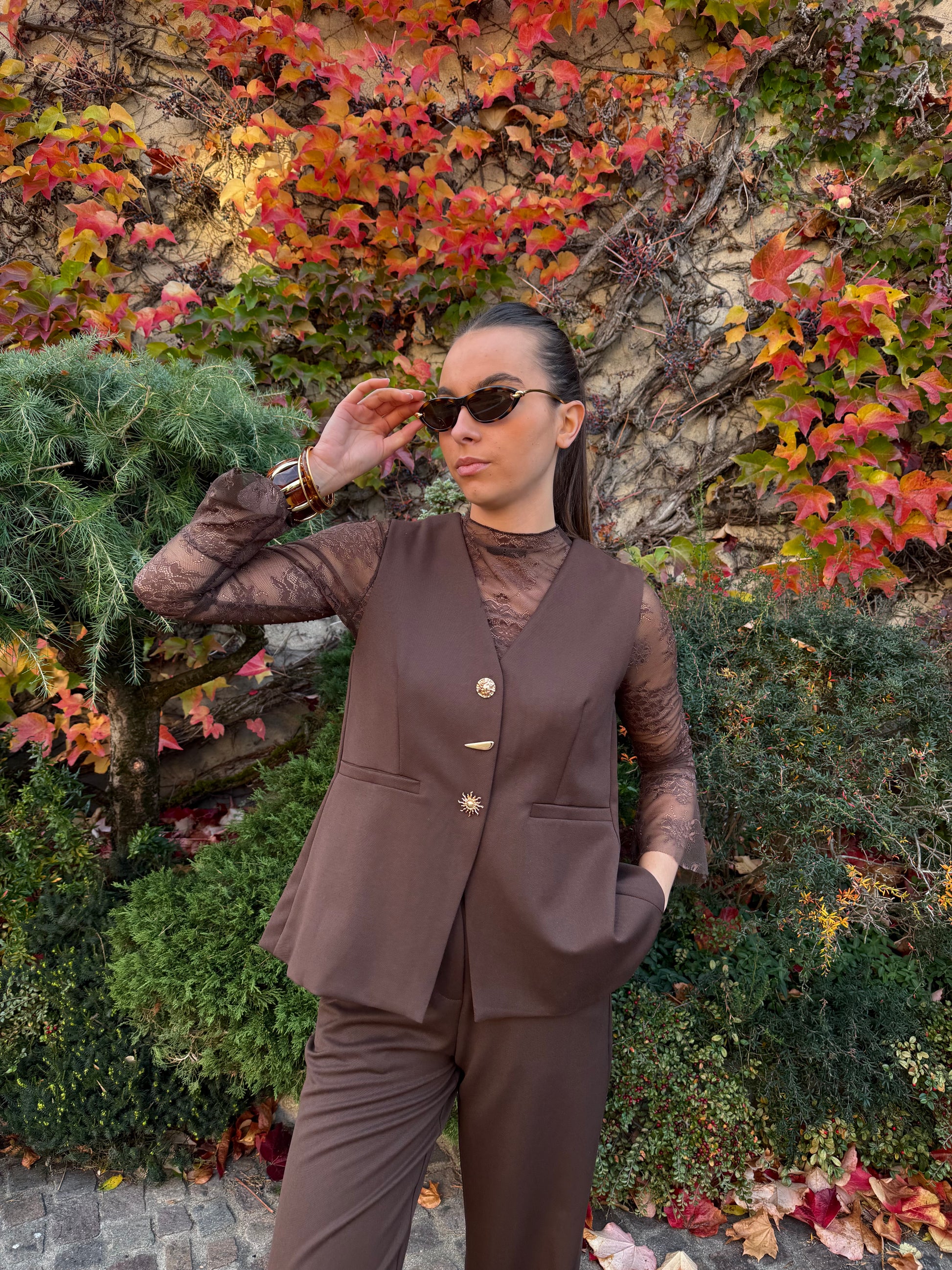 NOA, c’est la pièce qui ose : marron chaud, sans manches pour jouer sur les superpositions, et des boutons dorés tous différents pour un détail unique et ludique.