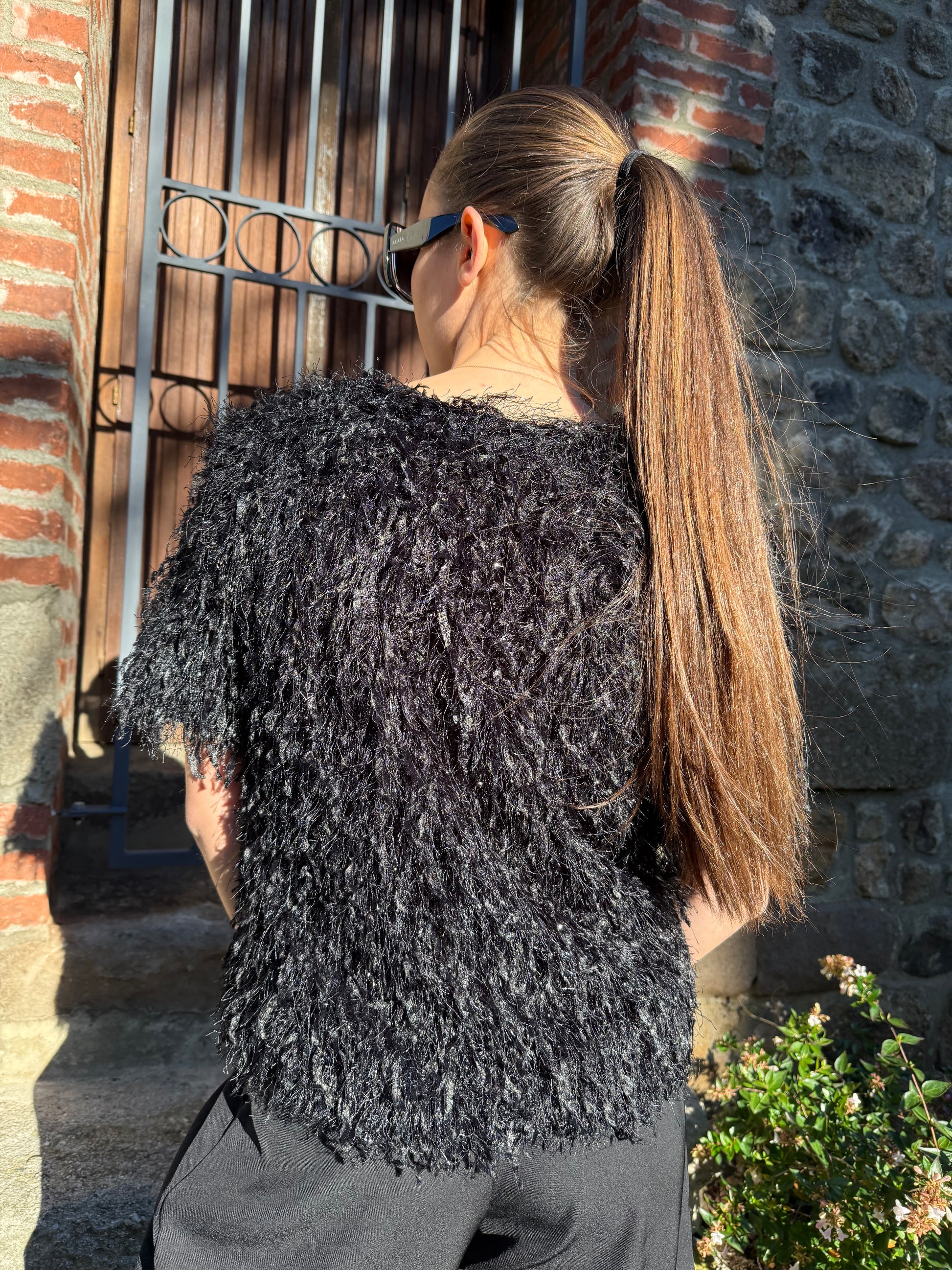 LENA, c’est la pièce coup de cœur pour un look ultra stylé : une fausse fourrure noire à poils longs, manches courtes, qui apporte ce petit plus d’audace et de douceur.