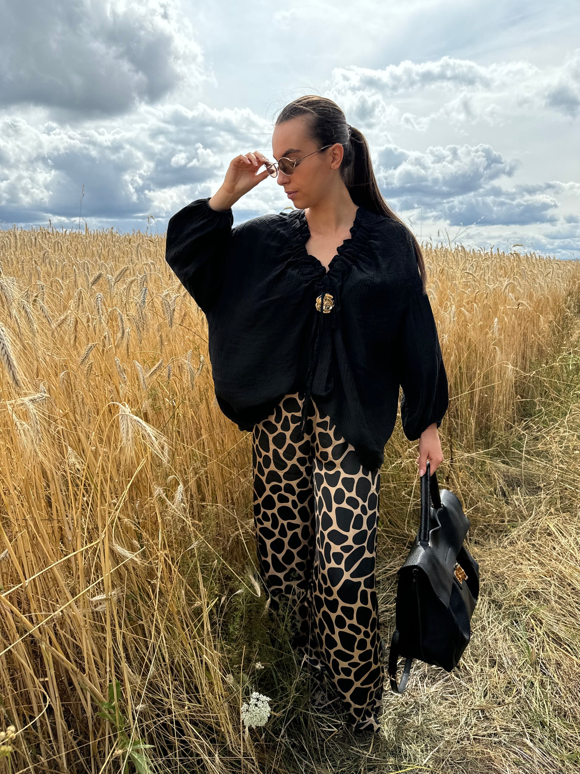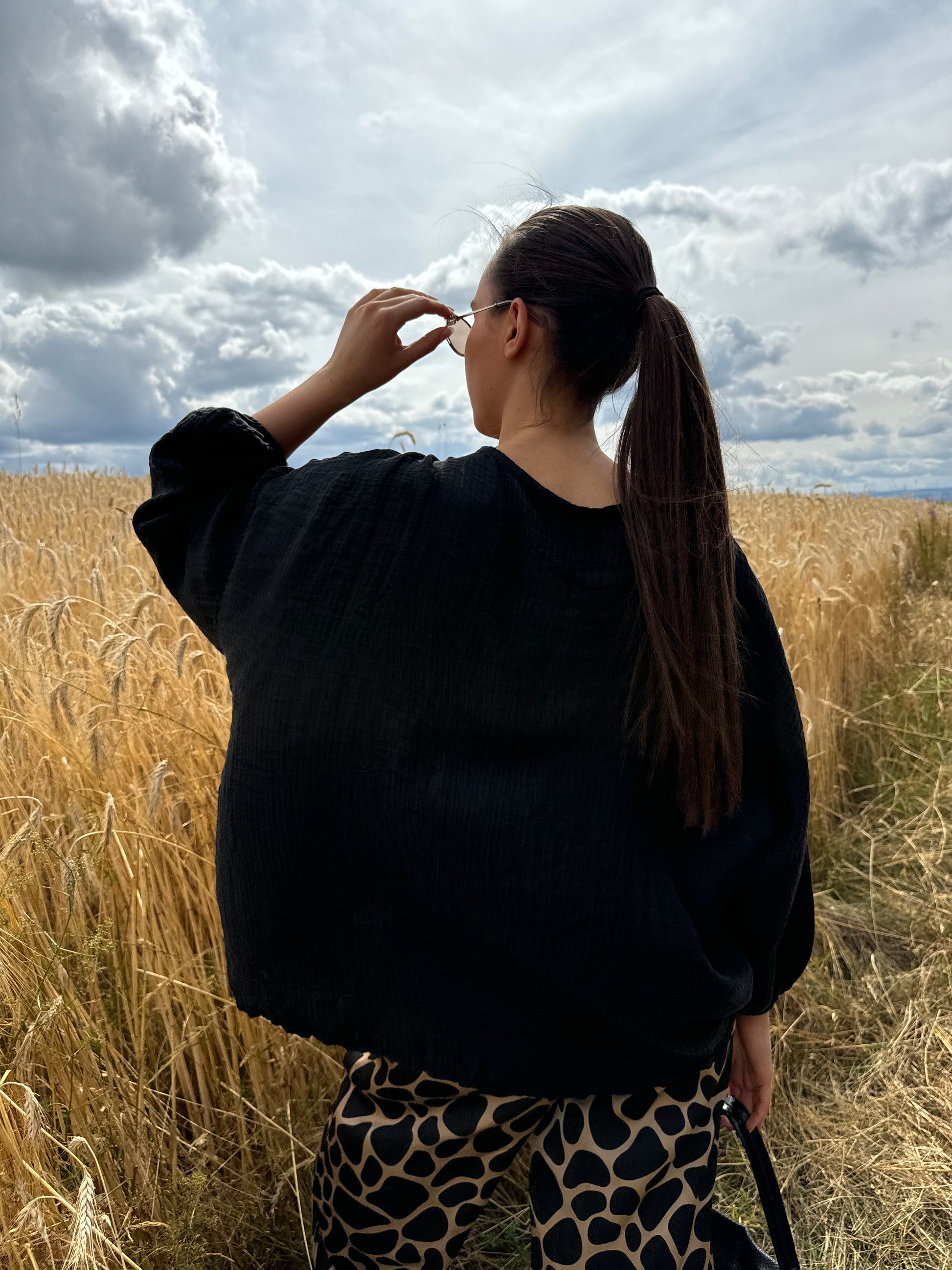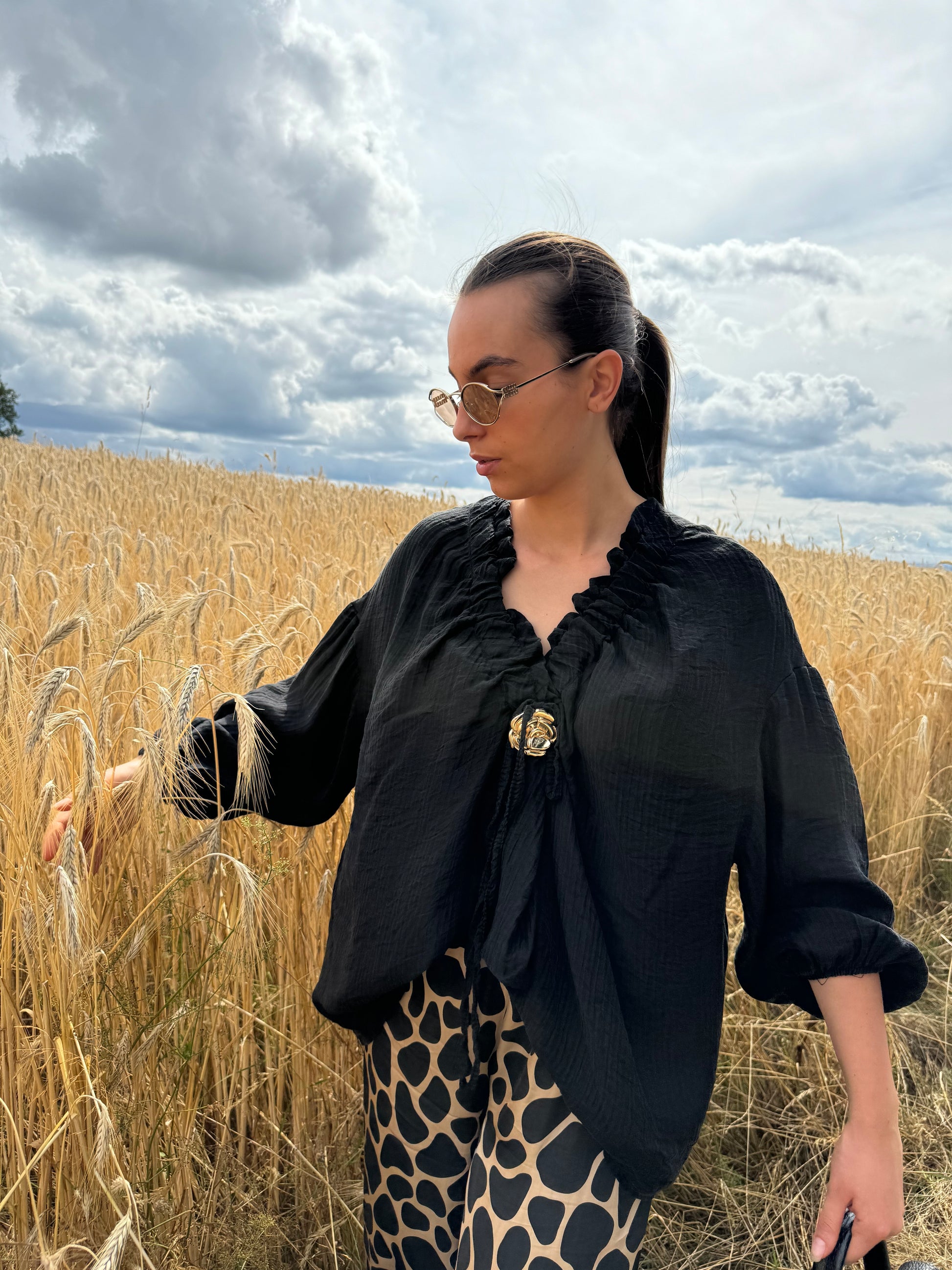 Avec ses manches larges, son tissu fluide et son fermeture bijou doré, NOIRAUDE devient la pièce forte du look — sans jamais en faire trop.