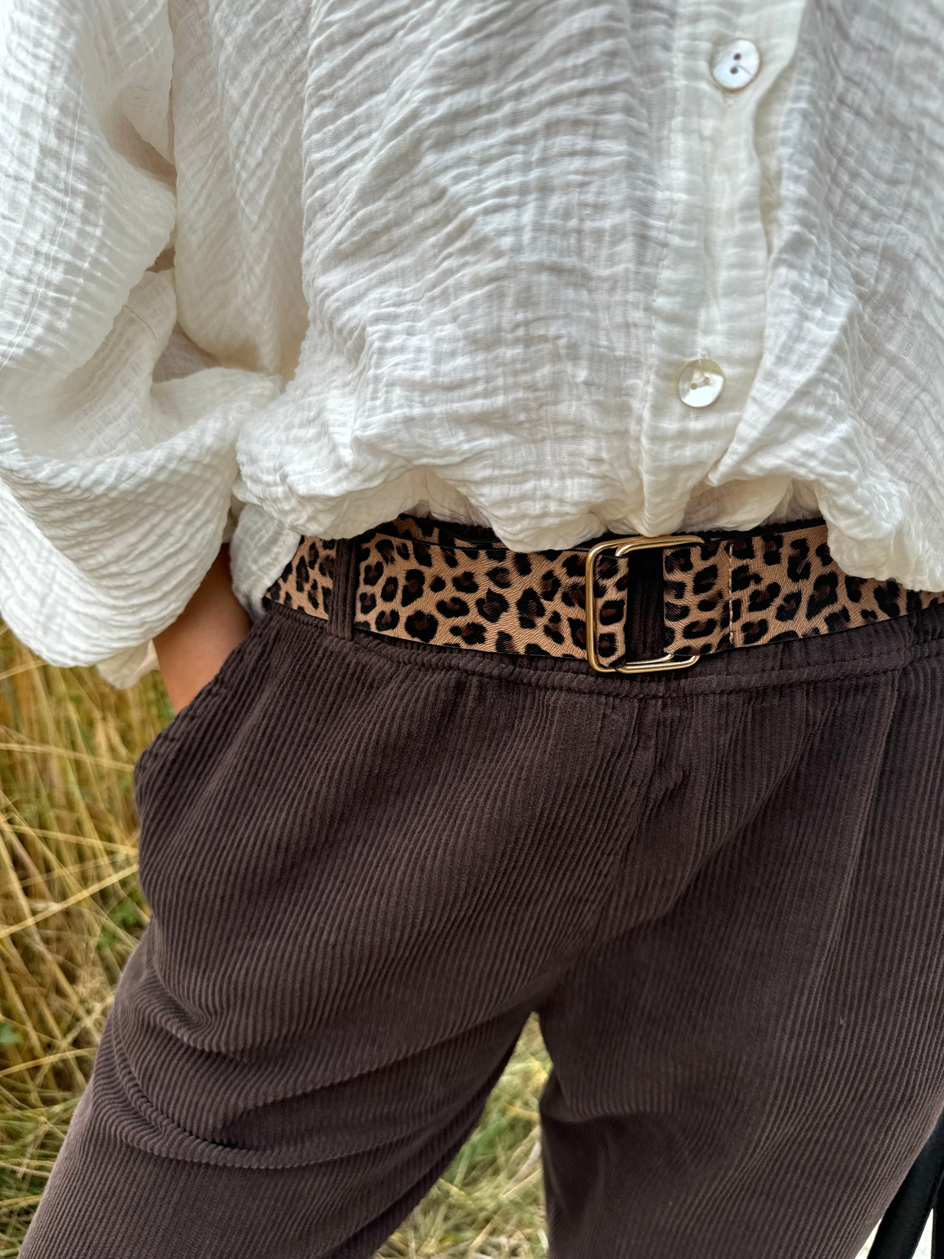 CLÉMENTINE allonge la silhouette avec sa coupe ajustée mais pas moulante, et attire le regard avec sa ceinture imprimée léopard.