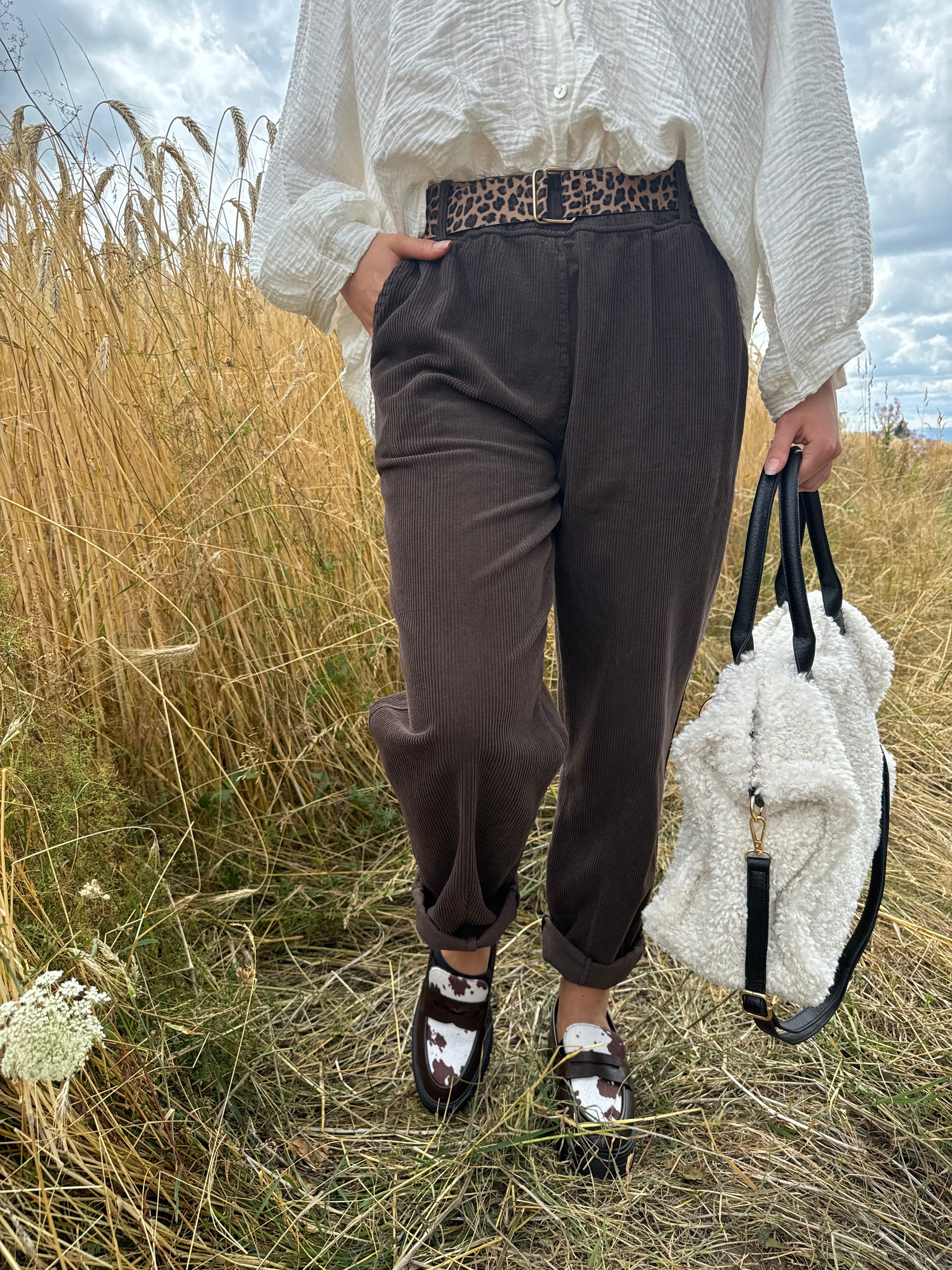 Le pantalon qui réchauffe la saison avec la douceur du velours et le pep’s du léopard.