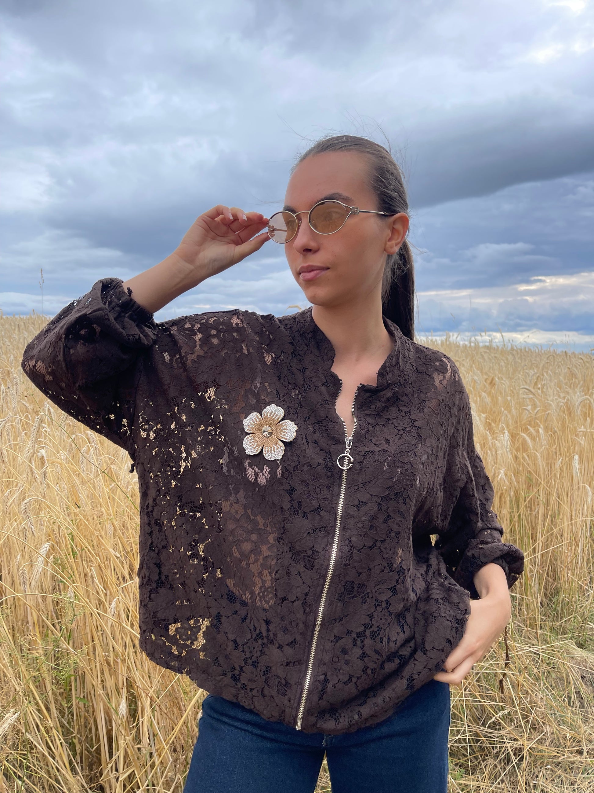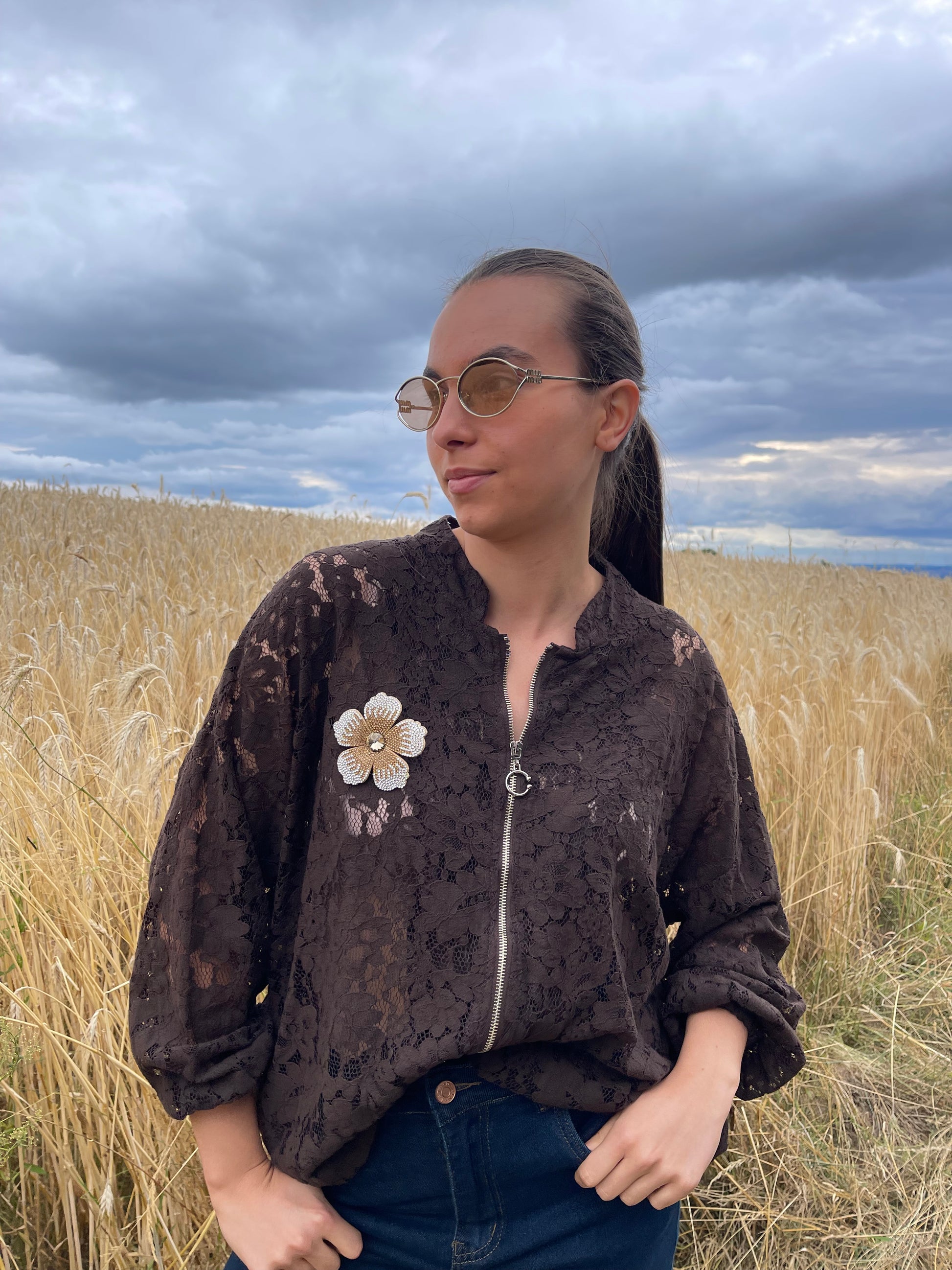 Calina est entièrement réalisée en dentelle marron, fine et légère, pour une allure féminine tout en subtilité.