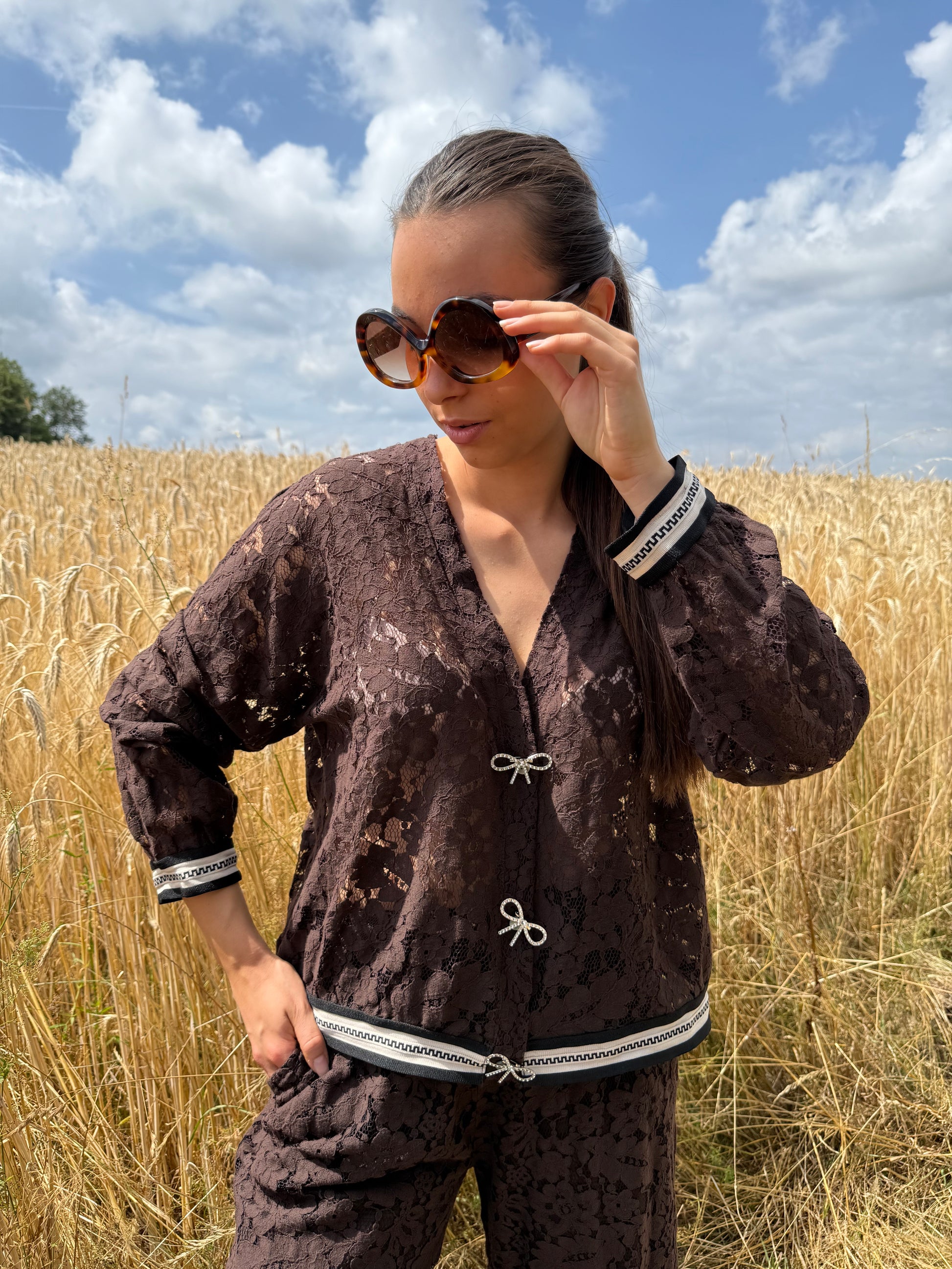 MARJOLAINE, c’est une veste en dentelle marron délicate, avec des finitions blanches contrastées et de jolis boutons-nœuds qui font toute la différence.