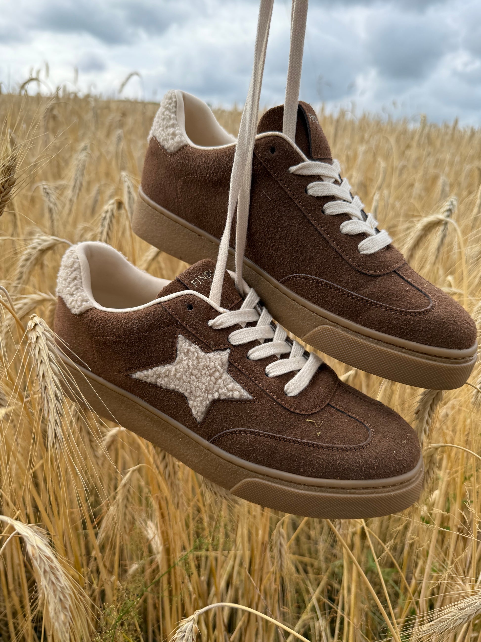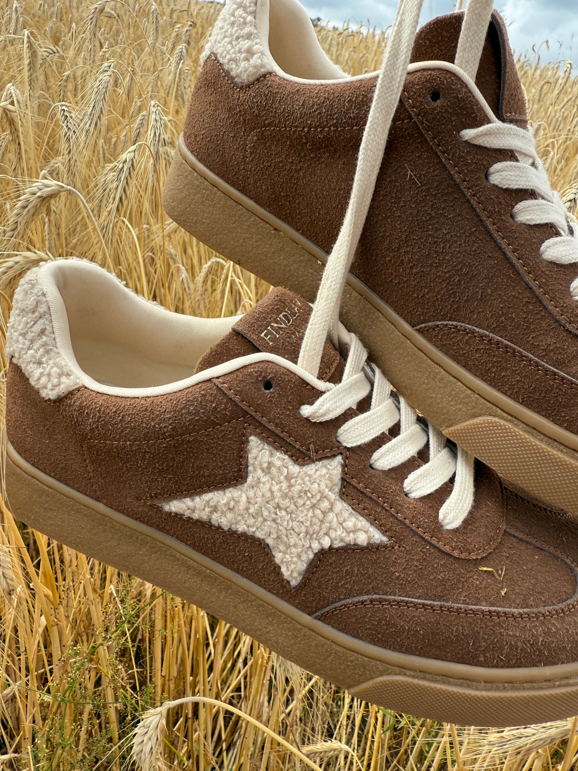 Un camel lumineux, une étoile en moumoute beige qui attire l’œil, et une touche toute douce au talon pour un effet cocooning inattendu.