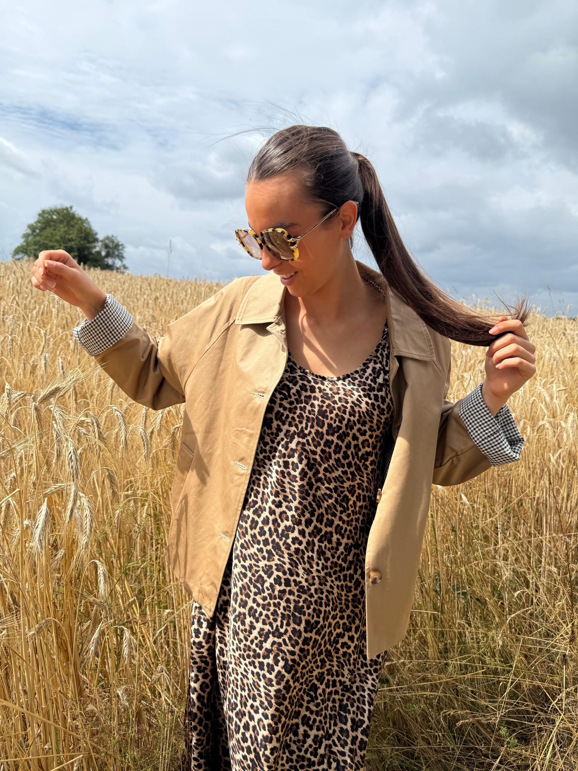 Sa couleur brun chaude s’accorde parfaitement avec les imprimés ou les tons neutres.