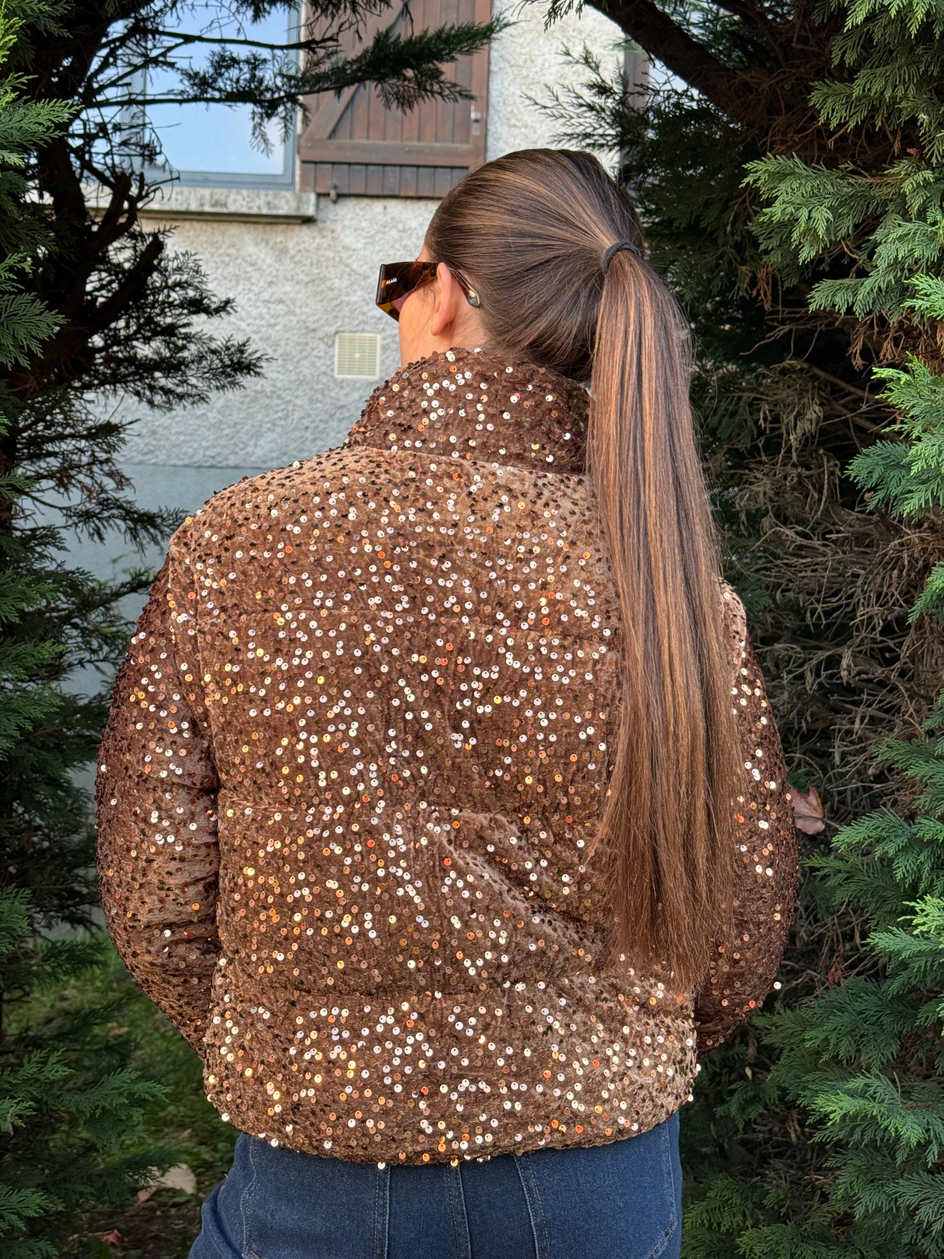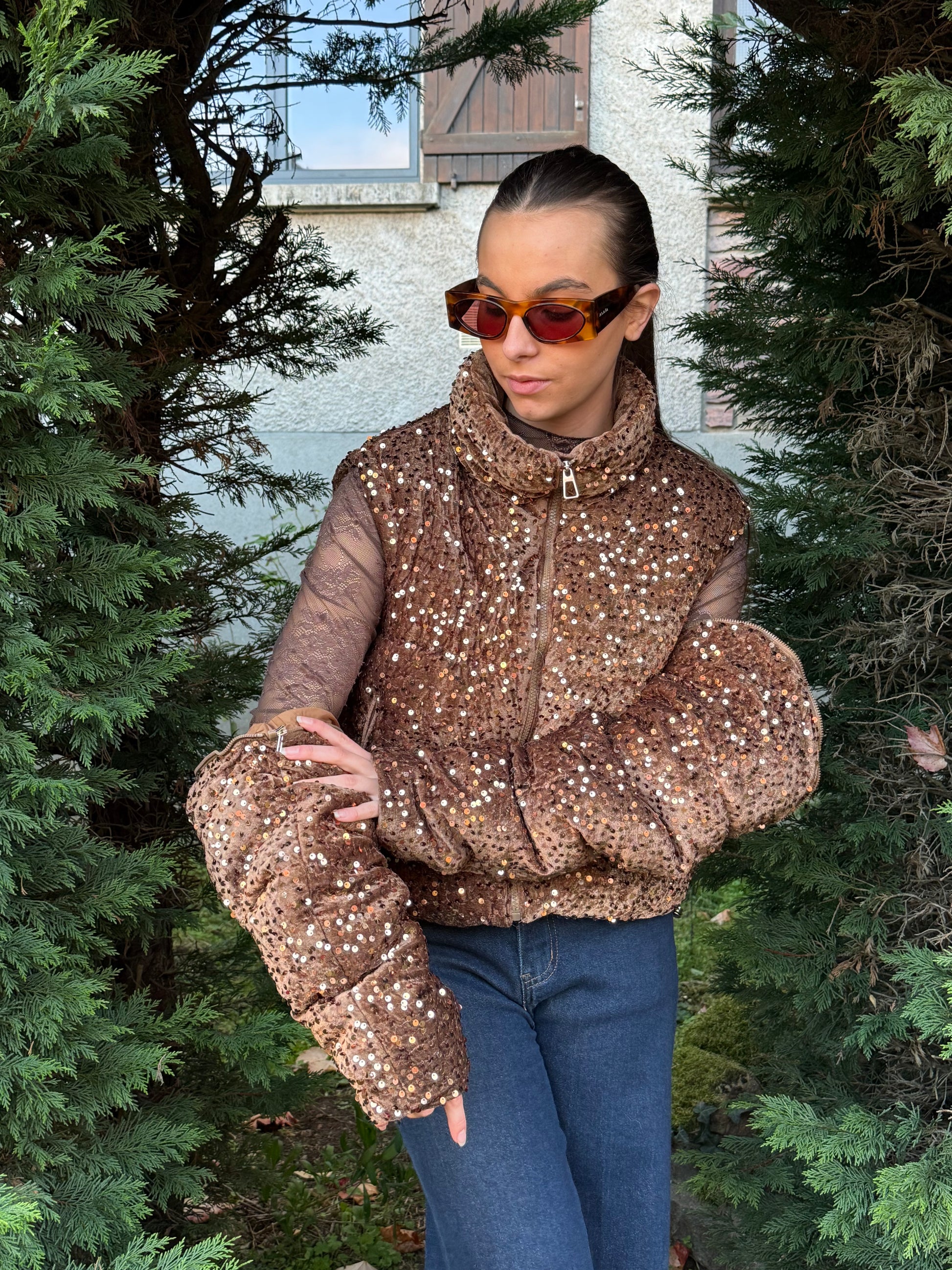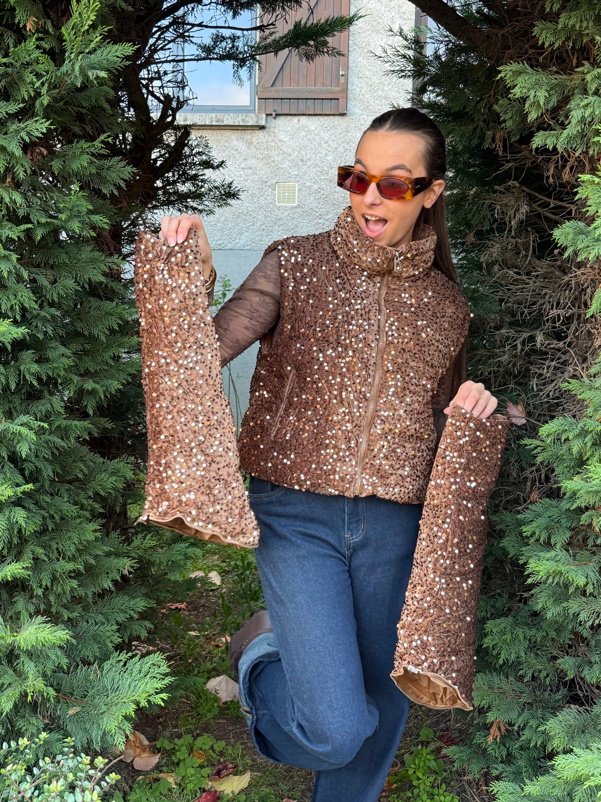 Une veste camel entièrement pailletée, qui capte la lumière à chaque mouvement. On adore sa fermeture zippée pratique et surtout son côté 2-en-1 : les manches se retirent en un clin d’œil pour la porter version gilet sans manches.